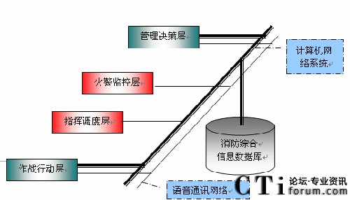通過對消防安全監(jiān)控指揮中心業(yè)務(wù)的分析,引進(jìn)先進(jìn)的數(shù)據(jù)通信網(wǎng)絡(luò)和語音通訊網(wǎng)絡(luò),我們可以將未來的消防業(yè)務(wù)層次抽象地概括為四層(如圖所示):管理決策層、火警監(jiān)測層、指揮調(diào)度層和作戰(zhàn)行動層。與管理決策層對應(yīng)的組織機(jī)構(gòu)為消防通信指揮中心;與火警檢測層、指揮調(diào)度層對應(yīng)包括消防指揮中心的接處警子系統(tǒng)、指揮調(diào)度等子系統(tǒng);與作戰(zhàn)行動層對應(yīng)的組織機(jī)構(gòu)為消防站(消防隊(duì))和消防車及消防隊(duì)員。