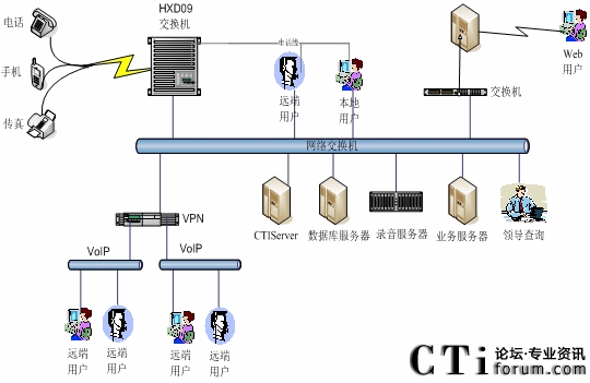 本系統(tǒng)物理結(jié)構(gòu)由交換機、CTI服務(wù)器、IVR(交互式語音應(yīng)答、服務(wù)器、業(yè)務(wù)代表座席(邏輯上分為:普通業(yè)務(wù)代表座席、專家座席等)、班長座席、統(tǒng)計維護(hù)管理工作站、因特網(wǎng)(WEB)服務(wù)器、電子郵件(EMAIL)服務(wù)器、數(shù)據(jù)庫/應(yīng)用服務(wù)器、錄音留言工作站、領(lǐng)導(dǎo)查詢工作站、業(yè)務(wù)網(wǎng)關(guān)服務(wù)器、通信網(wǎng)關(guān)、網(wǎng)絡(luò)系統(tǒng)等構(gòu)成。