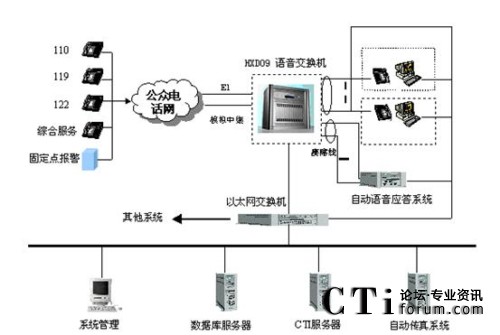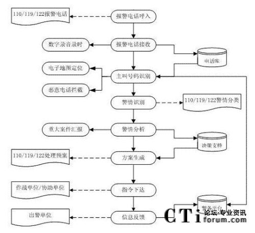 該系統(tǒng)主要分為電信子系統(tǒng)(完成聯(lián)動(dòng)中心與各電信公司之間話音的傳輸、交換和分配,以及主叫號(hào)碼和主叫地址的自動(dòng)查詢和傳輸?shù)龋、接警中心子系統(tǒng)(統(tǒng)一接聽(tīng)和處理市民的報(bào)警、求助電話)、指揮調(diào)度子系統(tǒng)(或稱為處警中心,通過(guò)直觀的地理信息系統(tǒng)和數(shù)據(jù)庫(kù),可以對(duì)所有的資源和警力分布了如指掌。通過(guò)一體化的無(wú)線數(shù)據(jù)傳輸和無(wú)線調(diào)度臺(tái)進(jìn)行方便的統(tǒng)一管理,指揮和調(diào)度)、信息網(wǎng)絡(luò)子系統(tǒng)(聯(lián)動(dòng)中心的骨干網(wǎng)絡(luò),把各種數(shù)據(jù)數(shù)庫(kù)、接處警席位、移動(dòng)的警用車載計(jì)算機(jī)等互聯(lián)在一起,形成一個(gè)強(qiáng)大的信息網(wǎng)絡(luò))、無(wú)線指揮調(diào)度通信子系統(tǒng)、大屏幕顯示子系統(tǒng)、地理信息子系統(tǒng)、GPS/GIS子系統(tǒng)。
