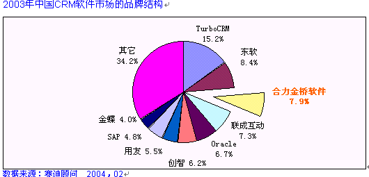 HOLLYCRM(合力金橋軟件)公司作為實力卓越的CRM主流廠商, 致力于提供最專業(yè)化的應用軟件和服務,提供以客戶為核心的信息化解決方案,服務領(lǐng)域跨越電信運營商、金融業(yè)、制造業(yè)等行業(yè)。在電信行業(yè)的CRM市場中,合力金橋軟件處于穩(wěn)固領(lǐng)先位置, 其推出的客戶關(guān)系管理解決方案,覆蓋協(xié)作型、運營型和分析型的全部范疇。在CRM產(chǎn)業(yè)在2003年的中國發(fā)展態(tài)勢整體放緩的大環(huán)境下, HOLLYCRM卻一枝獨秀, 在不到一年的時間里簽下中國網(wǎng)通總部、天津網(wǎng)通、山西網(wǎng)通、內(nèi)蒙聯(lián)通等大型CRM項目,積累了豐富的CRM項目實施經(jīng)驗。在累計的電信行業(yè)CRM軟件市場中,合力金橋軟件一家占有份額就達到24%, 合力金橋軟件此次在CCID年度研究報告中倍受矚目可謂眾望所歸, 充分說明了其CRM產(chǎn)品在高端行業(yè)的領(lǐng)軍地位, 如圖: