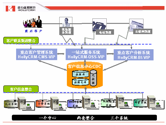 HOLLYCRM(合力金橋軟件)基于電信行業(yè)IT發(fā)展和山東省通信公司重點客戶管理系統(tǒng)建設(shè)目標(biāo)和原則的要求,根據(jù)多年來對電信CRM領(lǐng)域的研究以及在實際項目建設(shè)實施過程中的經(jīng)驗獲得,科學(xué)地提出了針本項目的"一個中心,二套整合,三個系統(tǒng)"的建設(shè)理念。如下圖:
