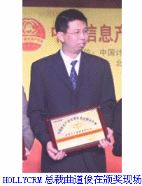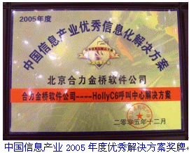 2006年1月10日,北京。中國計(jì)算機(jī)用戶協(xié)會(huì)"2005年度企業(yè)及產(chǎn)品頒獎(jiǎng)典禮"在世紀(jì)金源大飯店隆重召開。在Call Center(呼叫中心)及CRM(客戶關(guān)系管理)領(lǐng)域位居業(yè)界領(lǐng)先地位的HOLLYCRM(合力金橋軟件)公司自主知識產(chǎn)權(quán)的HollyC6呼叫中心解決方案再度成為業(yè)界關(guān)注焦點(diǎn),榮獲"中國信息產(chǎn)業(yè)2005年度優(yōu)秀解決方案"大獎(jiǎng)。