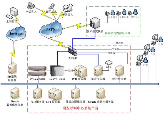 HollyContact(CTI中間件)等,搭建了一個為用友用戶進(jìn)行軟件應(yīng)用技術(shù)咨詢、軟件產(chǎn)品咨詢、軟件購買咨詢、故障受理、服務(wù)投訴、滿意度調(diào)查、客戶關(guān)懷等內(nèi)容的支撐系統(tǒng)。