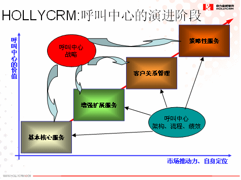 其次,我們認(rèn)為企業(yè)呼叫中心的建設(shè)不可能一次到位,而是一個(gè)持續(xù)改進(jìn)和不斷完善的過(guò)程。企業(yè)建設(shè)呼叫中心將是一個(gè)分階段分步驟的建設(shè)過(guò)程,將在其規(guī)劃的呼叫中心戰(zhàn)略的指引下和呼叫中心架構(gòu)、流程和績(jī)效的支撐上會(huì)經(jīng)歷基本核心服務(wù)、增強(qiáng)擴(kuò)展服務(wù)、客戶關(guān)系管理和策略性服務(wù)等幾個(gè)主要的階段,這就需要前期做好整體規(guī)劃,然后分階段實(shí)施,確保前期投資在后期依然可用就非常重要了,具體如下圖所示: