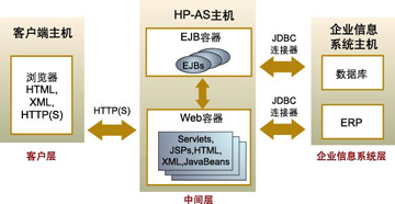 在一個(gè)開(kāi)發(fā)環(huán)境中把上述3層一般都安裝在同一臺(tái)計(jì)算機(jī)上,以便模擬3層環(huán)境。這樣,開(kāi)發(fā)者在實(shí)際環(huán)境開(kāi)發(fā)應(yīng)用之前,可以快速開(kāi)發(fā)和測(cè)試應(yīng)用?墒,在實(shí)際環(huán)境中,各個(gè)層一般位于不同的計(jì)算機(jī)上。圖2表示了HP-AS是如何采用J2EE技術(shù)實(shí)現(xiàn)分布式應(yīng)用的。