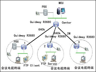 對(duì)于視頻的互通,則采用專用的視頻網(wǎng)關(guān),在中心處配置一臺(tái)MCU作為整個(gè)網(wǎng)絡(luò)視頻系統(tǒng)的管理者,1、2、3節(jié)點(diǎn)則配置具有視頻網(wǎng)關(guān)功能的視頻終端。在網(wǎng)上召開(kāi)視頻會(huì)議時(shí),各會(huì)場(chǎng)的加入和畫面的調(diào)度都由位于中心的MCU進(jìn)行控制。通過(guò)視頻網(wǎng)關(guān)壓縮的圖像的帶寬為512kbps。