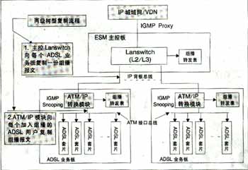 可實現(xiàn)高效的兩級組播;诳臻g總線上的組播信元技術(shù)實現(xiàn),與組播用戶數(shù)無關(guān),同一節(jié)目即使所有用戶加入該頻道,僅需復(fù)制一份,不用逐個用戶復(fù)制到每個用戶端口,極大節(jié)省了背板帶寬,減輕IP上行負擔(dān)。可實現(xiàn)高性能硬件組播轉(zhuǎn)發(fā)。IP上行板采用超大規(guī)模FPGA硬件邏輯處理組播報文,ADSL板采用空間組播處理硬件芯片自動完成向每個ADSL端口(用戶)的組播復(fù)制,每ADSL端口組播帶寬6M。