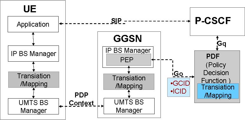 (3)PDF對IP流進行記錄(包括流標(biāo)識符(GCID)、數(shù)據(jù)速率、QoS類別等)并授權(quán)。通過SDP參數(shù)映射到所授權(quán)的IPQoS參數(shù)而實現(xiàn),并通過GO接口(COPS協(xié)議)傳送到GGSN。