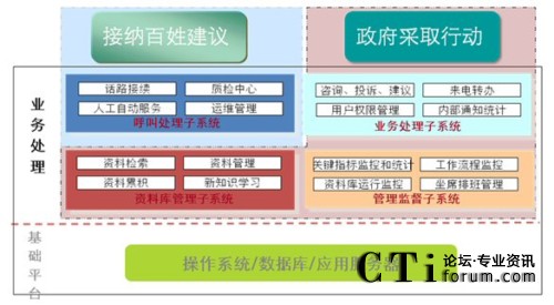 在架構(gòu)設(shè)計(jì)上,從電話(huà)接入、辦件流程、資料庫(kù)管理、信息維護(hù)到報(bào)表統(tǒng)計(jì)都實(shí)現(xiàn)了一體化設(shè)計(jì)理念。以業(yè)務(wù)流程設(shè)計(jì)為例,針對(duì)市民來(lái)電中的咨詢(xún)類(lèi)的問(wèn)題,12345政府熱線(xiàn)將直接由前臺(tái)接聽(tīng)人員利用各部門(mén)預(yù)先錄入資料庫(kù)中的規(guī)范答案來(lái)回答市民的提問(wèn);對(duì)市民反映、建議、投訴類(lèi)的來(lái)電,則由前臺(tái)記錄后轉(zhuǎn)給市信訪(fǎng)辦的后臺(tái)工作人員處理。一整套開(kāi)放性的工作流和穩(wěn)定的技術(shù)后臺(tái)支持確保了市民可以在規(guī)定的時(shí)間內(nèi)得到政府的權(quán)威處理與回復(fù)。