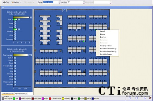 系統(tǒng)提供一整套管理工具,輔以圖形化的人性設計,將復雜的設備維護和系統(tǒng)優(yōu)化簡化為簡單的圖形管理,降低了維護難度和對維護人員的要求,提高了維護效率,使聯(lián)絡中心更為穩(wěn)定可靠地運行。座席地圖按真實座席位置展現(xiàn)座席狀態(tài),使業(yè)務代表服務質量的監(jiān)控和檢查更為形象高效,有利于提升業(yè)務代表服務質量。