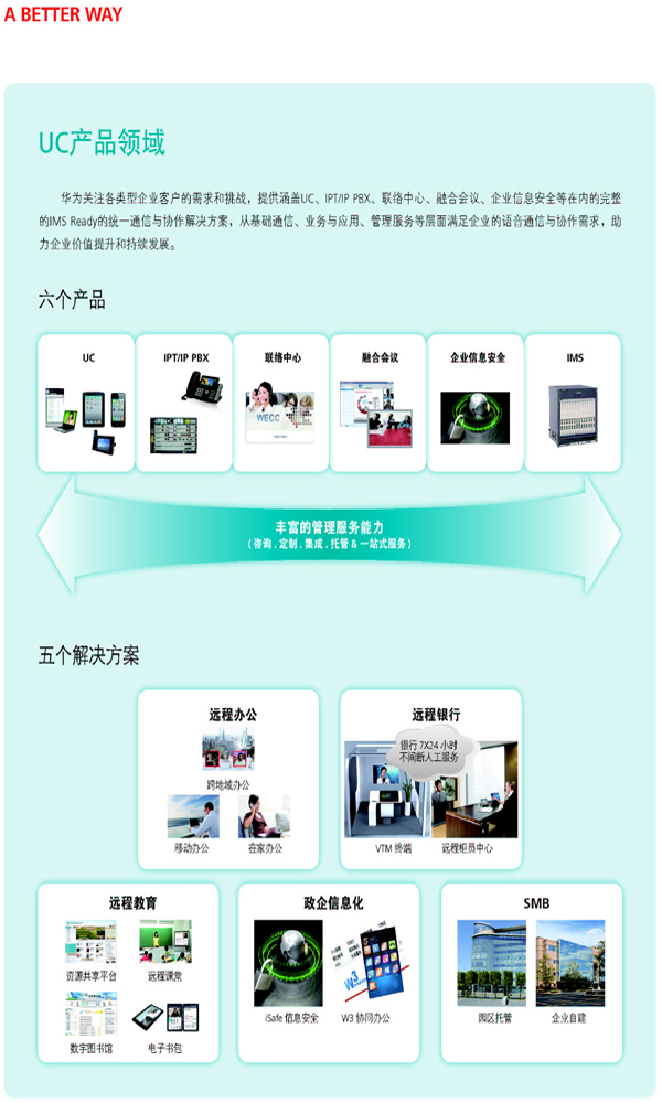 華為企業(yè)業(yè)務(wù)是華為三大業(yè)務(wù)集團之一。依托華為強大的研發(fā)和綜合技術(shù)能力,我們在企業(yè)業(yè)務(wù)領(lǐng)域與合作伙伴開放合作,理解客戶所需,致力于為全球政府及公共事業(yè)、金融、交通、電力、能源、商業(yè)企業(yè)及互聯(lián)網(wǎng)等行業(yè)以及大中小企業(yè)客戶提供全面、高效的ICT解決方案和服務(wù),包括IP基礎(chǔ)網(wǎng)絡(luò)、統(tǒng)一通信與協(xié)作、云計算與數(shù)據(jù)中心等。