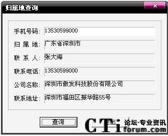 在A8電腦傳真機(jī)的電話商務(wù)通主界面,點(diǎn)擊歸屬地按鈕,出現(xiàn)手機(jī)歸屬地查詢界面,輸入手機(jī)號(hào)碼,點(diǎn)擊查詢,界面上會(huì)顯示出該手機(jī)的歸屬地,如果此號(hào)碼已在電話簿中,則界面上會(huì)同時(shí)顯示該電話對(duì)應(yīng)的聯(lián)系人信息。