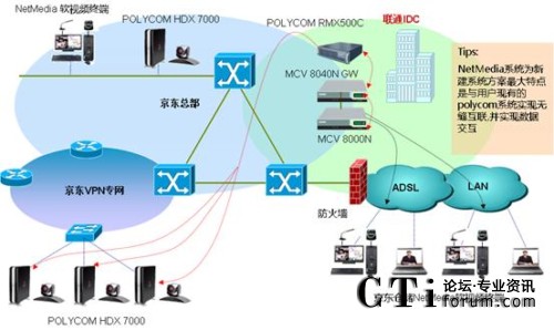 京東商城的NetMedia軟視頻會(huì)議MCU設(shè)備MCV8000N安裝在聯(lián)通的IDC,有10個(gè)倉(cāng)儲(chǔ)的網(wǎng)絡(luò)視頻會(huì)議室安裝硬件終端MCV2000N,另外40個(gè)倉(cāng)儲(chǔ)是在網(wǎng)絡(luò)視頻會(huì)議室的PC機(jī)上安裝一套NetMedia客戶端程序,各會(huì)議室終端通過(guò)ADSL撥號(hào)、3G無(wú)線上網(wǎng)、公司VPN專網(wǎng)等方式接入NetMedia軟視頻會(huì)議MCU。該系統(tǒng)以良好的網(wǎng)絡(luò)適應(yīng)性運(yùn)行在互聯(lián)網(wǎng)上,可保證音視頻低延時(shí)、高保真的交互,使各倉(cāng)儲(chǔ)間的技術(shù)交流和庫(kù)存數(shù)據(jù)交換常態(tài)化,為各地倉(cāng)儲(chǔ)間庫(kù)存數(shù)據(jù)交換、貨物調(diào)配提供了實(shí)時(shí)、快捷的溝通渠道。