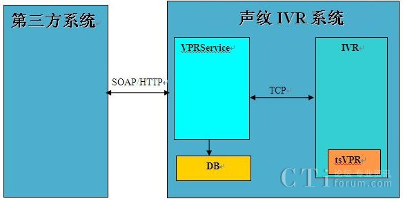 本系統(tǒng)主要由三部分組成:VPRService、IVR、tsVPR,其中VPRService的功能是負責(zé)跟外部其它系統(tǒng)(第三方軟件)交互和資料的管理;IVR的功能主要是負責(zé)系統(tǒng)業(yè)務(wù)流程;tsVPR是天聰聲紋識別引擎,負責(zé)聲紋登記和聲紋識別。