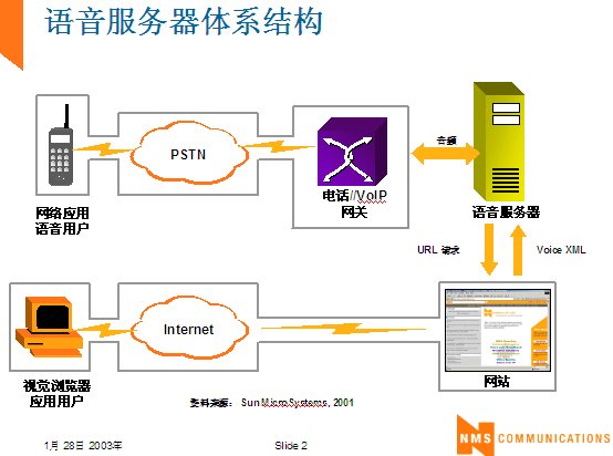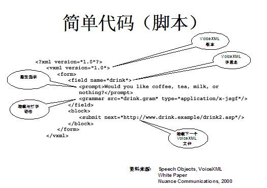 世界上最古老的用戶界面--人類語(yǔ)言終于在二十一世紀(jì)借助于VoiceXML,一種語(yǔ)音可擴(kuò)展標(biāo)記語(yǔ)言發(fā)展成熟起來(lái)。作為世界上第一個(gè)真正的語(yǔ)音通信標(biāo)準(zhǔn),它定義了應(yīng)用開發(fā)商向用戶提供新型信息訪問(wèn)服務(wù)的方式。通過(guò)這種服務(wù),用戶在任何地方,都可以通過(guò)電話或任何移動(dòng)設(shè)備,虛擬訪問(wèn)任何信息。VoiceXML正在被廣泛應(yīng)用于旅游、金融與信息服務(wù)等行業(yè)的各種業(yè)務(wù)領(lǐng)域中,甚至是政府部門與市政機(jī)構(gòu),全球的無(wú)線運(yùn)營(yíng)商等。