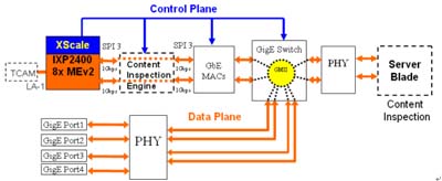 Inspection),表頭辨識(shí)系針對(duì)其流向、連結(jié)、輸入端口及目的地址等做比對(duì);內(nèi)容檢查則有復(fù)雜的算法,處理頻寬及內(nèi)存容量需求極高,很顯然內(nèi)容檢查即將是此系統(tǒng)非常嚴(yán)重的交通瓶頸所在,這個(gè)運(yùn)算將耗用大量IXP-2400網(wǎng)絡(luò)處理器的運(yùn)算資源。因此必須采用另一個(gè)處理器卸載此運(yùn)算,有兩種方法可行,其一是如圖四:加入一顆個(gè)可程序內(nèi)容檢查引擎(Programmable