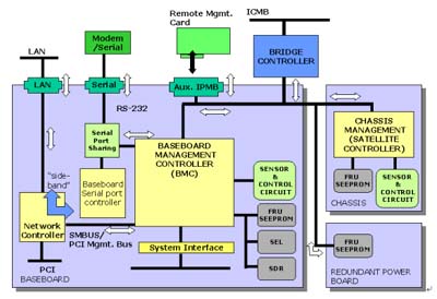 Controller (BMC)。它通過各別的界面來管理整個(gè)系統(tǒng),如系統(tǒng)狀態(tài)偵測(cè)及事件過濾、電源管理、記錄事件發(fā)生時(shí)間及系統(tǒng)回復(fù)控制,并且透過網(wǎng)絡(luò)或串行端口來告知管理人員,另外,它提供了IPMB的總線來和外部的管理控制器互相溝通。