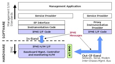 - 管理軟件:系統(tǒng)管理者最常接觸的就是上層的管理軟件,簡(jiǎn)單的類型就是使用一般的終端機(jī)(Terminal)程序來接收從Serial/Modem所傳送過來的文字訊息。近年來,除了BMC廠商會(huì)有自行開發(fā)的上層管理軟件外,也有不少的軟件廠商加入了開發(fā)管理軟件的行列,而他們最主要利用的溝通界面即為網(wǎng)絡(luò)界面。不管是通過序列或是網(wǎng)絡(luò),在界面上傳輸?shù)亩际荁MC所能辨認(rèn)的IPMI訊息。