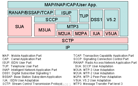 圖中粉紅色部分為SIGTRAN的協(xié)議棧,在它們之上的是對(duì)應(yīng)的電話信令協(xié)議。SIGTRAN的協(xié)議棧分為2層:一層是SCTP,它提供多個(gè)流的,可靠的數(shù)據(jù)傳輸,用戶數(shù)據(jù)的捆綁和分段,阻塞和流量控制,防止"拒絕服務(wù)"和"偽裝"的攻擊等功能。另一層是用戶適配層,圖中由SUA、M3UA、M2UA、M2PA、IUA和V5UA五個(gè)適配模塊所組成,它們分別來(lái)滿足各種電話信令協(xié)議適配的要求。