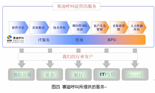 同時(shí),賽迪呼叫所推薦給企業(yè)的并非只是軟件,而是結(jié)合了賽迪呼叫豐富的運(yùn)營(yíng)服務(wù)經(jīng)驗(yàn)、技術(shù)服務(wù)能力的全方位信息化服務(wù)。賽迪呼叫的這種全面的信息化服務(wù),涵蓋IT服務(wù)、咨詢(xún)服務(wù)、BPO等,圖四給出了相應(yīng)展示。