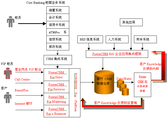 利用PowerCRM的銀行分析型CRM解決方案,對客戶信息進(jìn)行全面的分析,從而挖掘出許多客戶知識,繼而制定和改進(jìn)相應(yīng)的市場策略,應(yīng)用于PowerCRM運(yùn)營型CRM系統(tǒng)中,更好地指導(dǎo)營銷人員為客戶服務(wù)和完善客戶服務(wù)流程;同時也需要反饋到銀行內(nèi)部系統(tǒng),用于增強(qiáng)銀行內(nèi)部的運(yùn)營效率。
