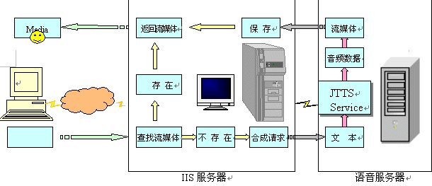 語(yǔ)音服務(wù)器方案是指利用捷通華聲在CTI領(lǐng)域成熟應(yīng)用的jTTS Service語(yǔ)音服務(wù)器,增加一臺(tái)或多臺(tái)語(yǔ)音服務(wù)器到現(xiàn)有的IIS服務(wù)系統(tǒng)的網(wǎng)絡(luò)環(huán)境中;在IIS服務(wù)器中,增加訪(fǎng)問(wèn)語(yǔ)音服務(wù)器的功能。當(dāng)IIS服務(wù)器需要流媒體輸出時(shí),向語(yǔ)音服務(wù)器發(fā)出請(qǐng)求,語(yǔ)音服務(wù)器接受IIS服務(wù)器的請(qǐng)求,并對(duì)請(qǐng)求的數(shù)據(jù)進(jìn)行合成、格式轉(zhuǎn)換,得到流媒體后返回給IIS服務(wù)器,IIS服務(wù)器再將此流媒體傳輸給用戶(hù)。