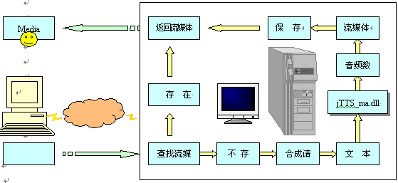 瀏覽器端(Explorer)發(fā)出瀏覽請(qǐng)求,網(wǎng)站服務(wù)器(IIS)根據(jù)請(qǐng)求查找流媒體(音頻流)文件,如有,則將流媒體返回客戶(hù)端,并啟動(dòng)客戶(hù)端的MS media player播放流媒體。若沒(méi)有,則向語(yǔ)音服務(wù)器(jTTS Service)發(fā)出合成請(qǐng)求,并將所需合成的文本通過(guò)Socket接口傳送至語(yǔ)音服務(wù)器;語(yǔ)音服務(wù)器響應(yīng)網(wǎng)站服務(wù)器的合成請(qǐng)求后,將調(diào)用jTTS合成技術(shù)進(jìn)行語(yǔ)音合成,并調(diào)用WMF SDK將生成的音頻文件轉(zhuǎn)換成流媒體格式ASF;通過(guò)Socket接口返回IIS服務(wù)器端后,將此流媒體文件存儲(chǔ)到指定的Web目錄,同時(shí)將流媒體返回瀏覽器端,啟動(dòng)MS media player播放。其流程如下: