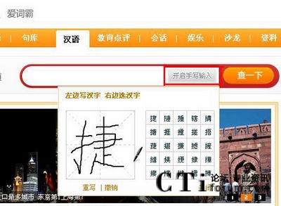 打開(kāi)金山軟件公司的愛(ài)詞霸漢語(yǔ)網(wǎng)站,點(diǎn)擊 “開(kāi)啟手寫(xiě)輸入”選項(xiàng),進(jìn)入手寫(xiě)輸入框界面,輸入框簡(jiǎn)潔清爽,用戶(hù)可通過(guò)鼠標(biāo)取代鍵盤(pán)和手寫(xiě)板,自由在搜索框中輸入關(guān)鍵字。