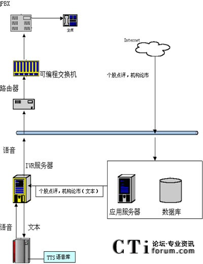 技術(shù)實現(xiàn)上,證券交易所可從網(wǎng)上下載個股點評信息或熱門個股信息,之后將這些信息的文本傳遞給IVR服務(wù)器,IVR會通過調(diào)用TTS服務(wù)器得到這些信息的語音流,之后就可以在坐席上播放這些信息的語音了。如圖所示: