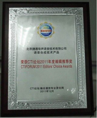 CTI論壇(ctiforum)1月4日消息(記者 張潔): 近日,由CTI論壇主辦的2011年度“編輯推薦獎”評選結果正式揭曉,捷通華聲語音合成技術產品榮獲CTI論壇2011年度編輯推薦獎。