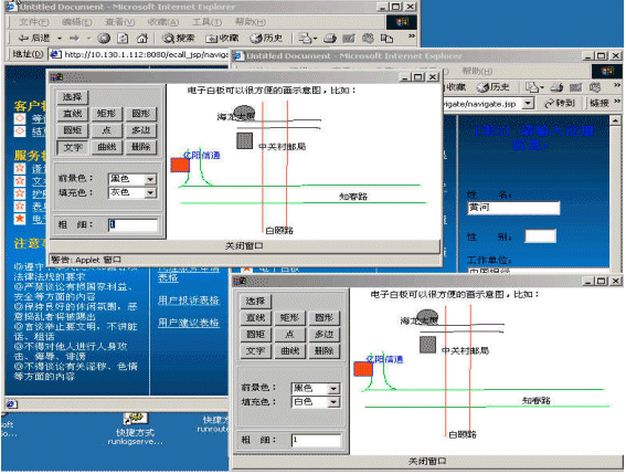 電子白板功能是在語音文字交談之外,ICWEB為用戶提供的圖形交談工具。電子白板允許多個在線用戶同時在界面里繪制刪除任意圖形,寫字、插入圖片以及用標(biāo)志工具標(biāo)示某些區(qū)域。電子白板功能可以有效地補充文本交談功能所不具備的圖示功能。