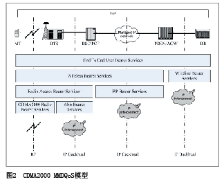 over IP稱為移動IP Phone。圖3顯示了CDMA2000 LMSD網(wǎng)絡(luò)為了滿足端到端QoS要求,而設(shè)置的多層不同承載服務(wù)級別、網(wǎng)元間的端到端QoS保證機(jī)制。