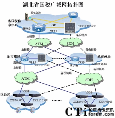 湖北省國稅三級專網(wǎng)已經(jīng)建成,但是存在單點(diǎn)單鏈路隱患,為了保證網(wǎng)絡(luò)可靠運(yùn)行,2006年湖北國稅攜手中興通訊對省國稅系統(tǒng)的網(wǎng)絡(luò)進(jìn)行備份網(wǎng)絡(luò)改造,結(jié)合稅務(wù)系統(tǒng)金稅三期網(wǎng)絡(luò)需求,網(wǎng)絡(luò)改造采用SDH線路來組建高帶寬的廣域網(wǎng)絡(luò),同時與原有的網(wǎng)絡(luò)設(shè)備(包括路由器、交換機(jī))及網(wǎng)絡(luò)接入設(shè)備實現(xiàn)互連互通,互為備份。
