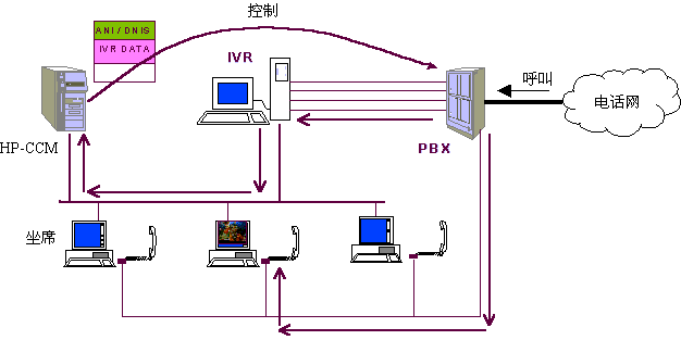 在任何一個(gè)步驟中,如客戶選擇了人工坐席,則IVR請(qǐng)求CCM根據(jù)多種情況選擇一個(gè)空閑坐席(選擇方法見(jiàn)下文)并控制PBX將呼叫與選擇的人工坐席接通,同時(shí)系統(tǒng)在客戶對(duì)IVR操作的過(guò)程中,已經(jīng)幀測(cè)到了客戶所使用的電話號(hào)碼、客戶的按鍵信息,系統(tǒng)還記錄有客戶上次的呼叫情況等數(shù)據(jù),這些數(shù)據(jù)基本上可以確定客戶大體關(guān)心的問(wèn)題,對(duì)于老客戶甚至可以初步認(rèn)定呼叫者的身份、年齡、性別、業(yè)務(wù)辦理情況等,因此,話務(wù)員在與客戶談話之前就已經(jīng)了解了相當(dāng)多的信息,并控制選定的坐席屏幕顯示有關(guān)客戶信息,便于直接進(jìn)入正題,提高了效率。客戶與坐席的交流過(guò)程中,坐席可通過(guò)終端請(qǐng)求CCM控制PBX將本次呼叫與其他話務(wù)員(坐席)、專家或業(yè)務(wù)辦公室(如內(nèi)線電話)等接通,當(dāng)坐席人員將呼叫轉(zhuǎn)移到另一坐席或?qū)<視r(shí),系統(tǒng)將在本呼叫中收集的各類數(shù)據(jù)同時(shí)轉(zhuǎn)向下一坐席電腦。在坐席人員解答客戶問(wèn)題時(shí),可將問(wèn)題及解答情況收集,便于分析坐席人員的業(yè)務(wù)素質(zhì)和問(wèn)題傾向,從而有針對(duì)性地培訓(xùn)坐席人員。對(duì)于客戶來(lái)講,他可以通過(guò)電話按鍵在話務(wù)員、自動(dòng)語(yǔ)音、傳真、專家和業(yè)務(wù)辦公室之間漫游,系統(tǒng)將記錄客戶漫游的路徑,對(duì)于設(shè)計(jì)較好的菜單和路經(jīng)來(lái)說(shuō),客戶的漫游路徑基本上可以反映出其需求,大量客戶的漫游路徑無(wú)疑將反映出市場(chǎng)需求。
