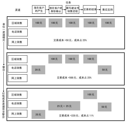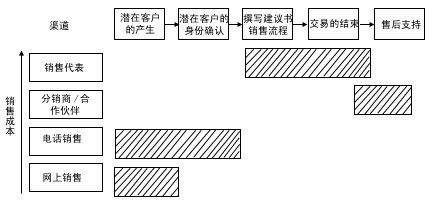 渠道整合強(qiáng)調(diào)在一個(gè)銷售過程中分工的不同給企業(yè)帶來更多的利潤,將銷售過程的任務(wù)一一分配給不同成本的渠道來完成。銷售過程的中間環(huán)節(jié)——面對(duì)面的銷售和交易的達(dá)成,通常需要由成本較高的區(qū)域銷售代表和分銷伙伴來完成,客戶的產(chǎn)生及身份的確認(rèn)和售后服務(wù)環(huán)節(jié)通常由低成本渠道完成,F(xiàn)在,我們對(duì)照?qǐng)D4來比較一下: