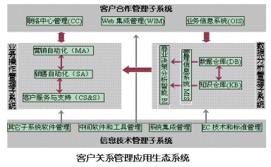 根據(jù)目前IT產(chǎn)業(yè)領(lǐng)域和管理界對CRM的開發(fā)、討論及應(yīng)用的經(jīng)驗和反饋,綜合來講,一個完整的客戶關(guān)系管理應(yīng)用系統(tǒng)由如下四大生態(tài)子系統(tǒng)組成: