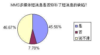 問卷的調(diào)查結(jié)果有些屬于意料之中,有些則暫一定程度上給運(yùn)營(yíng)商和終端提供上潑了冷水。不過,有一點(diǎn)是讓提供移動(dòng)服務(wù)的企業(yè)感到欣慰和滿意的,那就是:最終用戶對(duì)MMS的接受程度相當(dāng)高,除去對(duì)資費(fèi)、操作的質(zhì)疑外,幾乎90%以上的用戶都認(rèn)為MMS廣泛流行是一個(gè)必然的趨勢(shì)。下面我們就讀者們廣泛關(guān)注的問題來(lái)研究一下。