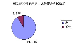 題8的調(diào)查結(jié)果對(duì)于中國(guó)移動(dòng)來(lái)講絕對(duì)是充滿誘惑的,高達(dá)91.11%的被訪者表示他們非常愿意嘗試MMS的功能和服務(wù),無(wú)疑這對(duì)ICP們(MMS服務(wù)的重要載體)也是一針強(qiáng)心劑!