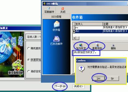 3、點(diǎn)按主窗口下方的"覓友"按鈕,彈出的對(duì)話框中選擇三種添加方式之一后按"下一步"進(jìn)行好友的添加;當(dāng)有人加你為好友時(shí),系統(tǒng)會(huì)有提示音閃并DICO圖標(biāo)在任務(wù)欄不斷閃爍,你點(diǎn)擊上來(lái)后會(huì)彈出你的DICO郵箱對(duì)話框并收到有某某加你為好友的消息,此時(shí)可先點(diǎn)按"查看資料"了解一下來(lái)人相關(guān)信息;若有意可點(diǎn)按"加產(chǎn)好友"加來(lái)訪者為好友(下圖7)。