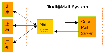如果選用Jindi MailServer作為外部郵件服務(wù)器,可以在同一臺外部郵件服務(wù)器上配置可選的MailGate模塊,該模塊可以將指定域用戶的郵件進行定向投遞,而不依賴DNS的配置。內(nèi)部郵件通過內(nèi)部DNS在郵件網(wǎng)關(guān)處進行存儲轉(zhuǎn)發(fā)到外部。