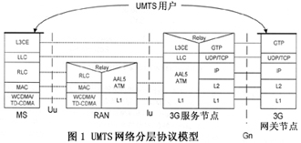 對(duì)圖1的簡要描述如下:移動(dòng)用戶(MS)到RAN左側(cè)部分是無線接入網(wǎng)絡(luò)的無線用戶接口(Uu),實(shí)現(xiàn)了用戶業(yè)務(wù)通過空中無線鏈路接入3G網(wǎng)絡(luò)的功能,主要包含物理層(采用WCDMA和TD-CDMA技術(shù))、媒體接入層(MAC)、無線鏈路層(RLC);在RAN內(nèi)部通過協(xié)議中繼(Relay)實(shí)現(xiàn)無線鏈路和有線鏈路的對(duì)接;在RAN和3G服務(wù)節(jié)點(diǎn)之間的接口(Iu)是以ATM技術(shù)為支撐的有線接入段協(xié)議,為支持Internet業(yè)務(wù),采用AAL5適配層協(xié)議,物理層(L1)無明確限定具體傳輸方式;在此之上,透過RAN、MS和3G服務(wù)節(jié)點(diǎn)之間存在兩個(gè)高層連接,即邏輯聯(lián)絡(luò)層(LLC)和更為復(fù)雜的第三層實(shí)體(L3CE),L3CE是一些以Client/Server方式構(gòu)件的軟件實(shí)體,實(shí)現(xiàn)諸如無線資源管理、呼叫控制、移動(dòng)管理等網(wǎng)絡(luò)級(jí)功能;在3G服務(wù)節(jié)點(diǎn)內(nèi)部,為實(shí)現(xiàn)到Internet網(wǎng)絡(luò)的接入,再作一次協(xié)議中繼,這里,第三層實(shí)體的信息映射到通用分組無線服務(wù)的隧道協(xié)議GTP(GPRS Tunneling Protocol);3G服務(wù)訪問點(diǎn)到3G網(wǎng)關(guān)之間的Gn接口存在清晰的、以TCP/IP協(xié)議為主體的五層對(duì)應(yīng)關(guān)系;構(gòu)建在最上層的是移動(dòng)用戶到3G網(wǎng)關(guān)的UMTS用戶進(jìn)程,它通過3G網(wǎng)關(guān)進(jìn)入Internet骨干網(wǎng),最終實(shí)現(xiàn)用戶對(duì)Internet的訪問。