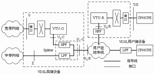 、 VTU-R 分別是位于局端和用戶端的VDSL收發(fā)器。業(yè)務(wù)分離器(Splitter ,包括HPF和LPF)將同一對(duì)電話銅纜上傳輸?shù)腣DSL與窄帶業(yè)務(wù)(或ADSL)
