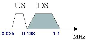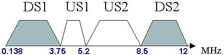 VDSL使用的頻譜較寬,最高可達(dá)12 MHz 。這一頻譜范圍可被分割為若干下行(DS)和上行(US)頻段,國(guó)際上常用的頻段劃分方式(Band