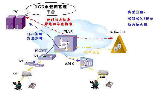 所有用戶接入BAS,BAS通過CAR可以對不同的用戶限制帶寬,PC分配較低的優(yōu)先級及帶寬,而對IAD分配較高的優(yōu)先級和帶寬,防止普通用戶對帶寬的無節(jié)制濫用。PS可以動態(tài)收集BAS設備的帶寬使用情況,同時通過與軟交換的交互,了解NGN業(yè)務的帶寬需求,從而在BAS上可按用戶及業(yè)務的粒度進行動態(tài)QoS策略配置,為用戶提供差異性業(yè)務,保證用戶的SLA。PS可以下發(fā)QoS策略給BAS,BAS交換機可以進一步通過協(xié)議(各廠家私有協(xié)議)下發(fā)QoS策略給下掛的L2交換機。