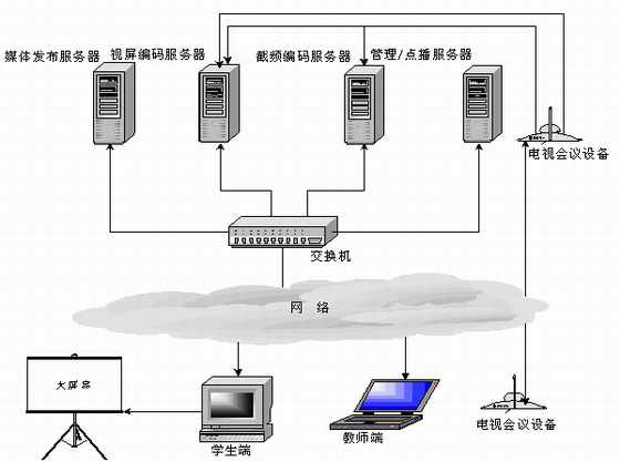 當(dāng)老師端在異地時(攝像頭離服務(wù)器較遠(yuǎn),無法物理連接),可通過“電視會議系統(tǒng)”將老師的圖像及聲音實時傳送到編碼服務(wù)器,桌面課件可以通過PcAnywhere傳送到編碼服務(wù)器。圖像,聲音和桌面課件通過Web Streaming采集壓縮并在網(wǎng)上實時廣播。這種系統(tǒng)架構(gòu)也是當(dāng)今功能比較齊全和完善的一種實現(xiàn)方式。