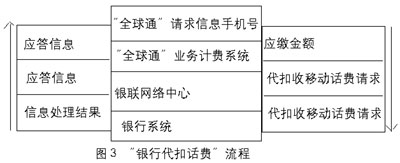 在從銀行賬戶代扣收“全球通”客戶移動(dòng)話費(fèi)時(shí),由兩筆交易完成這一業(yè)務(wù)功能,第一筆交易為查詢交易,確定應(yīng)繳移動(dòng)話費(fèi)的金額,第二筆交易為實(shí)際的賬務(wù)性的繳費(fèi)交易,金額為上一筆交易的返回結(jié)果,兩筆交易的交易流程則完全一樣。