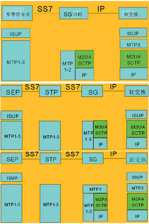 ·信令網(wǎng)關(guān)(SG)終結(jié)MTP2協(xié)議,將MTP2、MTP3之間的原語封裝為M2UA消息,在信令網(wǎng)關(guān)功能和軟交換設備間傳遞,信令網(wǎng)關(guān)與軟交換分別實現(xiàn)MTP1/2和3層功能;