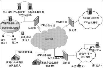 在實(shí)際建立的系統(tǒng)中,采用了公司內(nèi)部3臺(tái)服務(wù)器。一臺(tái)ICC主要用作登錄認(rèn)證及用戶(hù)和服務(wù)器管理;2臺(tái)ICS服務(wù)器,一臺(tái)布置在防火區(qū),供外網(wǎng)用戶(hù)的訪(fǎng)問(wèn),一臺(tái)在內(nèi)網(wǎng),供公司內(nèi)部員工使用。在公司外面,托管了一臺(tái)ICS(通訊服務(wù)器),供公司外部用戶(hù)訪(fǎng)問(wèn)。