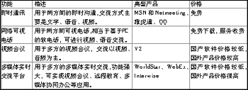 從結構上,軟件視頻產(chǎn)品基本分為兩大類:一類是點對點,另一類是一點對多點。點對點產(chǎn)品僅限于兩人之間的交流,此類典型產(chǎn)品有微軟的MSN和NetMeeting、Yahoo的雅虎通、QQ等;一點對多點產(chǎn)品用于多方的實時交流,此類產(chǎn)品是各種軟件解決方案的軟件視頻會議產(chǎn)品,如:北京捷先科技的WorldStar、威速公司的V2等。根據(jù)用途的不同,軟件視頻產(chǎn)品大致分為即時通訊產(chǎn)品(如MSN和NetMeeting、雅虎通、QQ)、網(wǎng)絡可視電話產(chǎn)品、視頻會議產(chǎn)品(如:V2)、多媒體實時交流平臺產(chǎn)品(如:WorldStar、WebEx、Interwise等),分類如表。