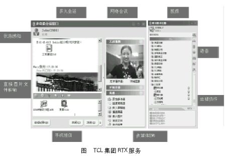 RTX產(chǎn)品支持標(biāo)準(zhǔn)的SIP、H.323 IP電話協(xié)議,并采用高質(zhì)量的QoS技術(shù)保證實(shí)時(shí)通信網(wǎng)絡(luò)質(zhì)量,使得TCL集團(tuán)公司的用戶可以與同事之間采用語音或者視頻的面對(duì)面的交流(如圖),相當(dāng)于給集團(tuán)公司的任何一位RTX用戶配備了一部集成的視頻和語音電話。目前這項(xiàng)服務(wù)在集團(tuán)公司非常受歡迎,尤其是遠(yuǎn)程的代表處和集團(tuán)總部之間的信息交流更直接、更快捷,在一定程度上取代了電話的功能,大大節(jié)約了通信費(fèi)用。比如,TCL空調(diào)的計(jì)劃部每天需要和全國20多個(gè)代表處的計(jì)劃處進(jìn)行數(shù)據(jù)往來,以前需要電話完成的功能現(xiàn)在通過RTX的即時(shí)文字、短信和語音對(duì)講完成,大大提高效率,節(jié)省了通信成本。